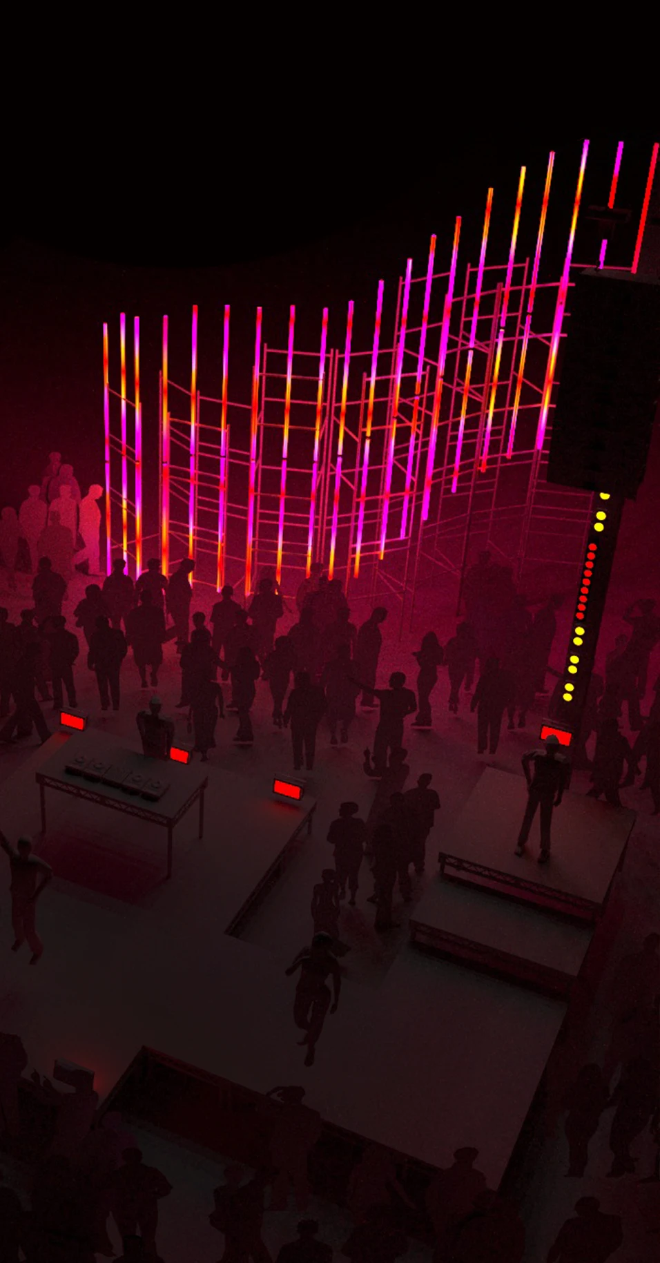 Equipamentos DMX (Mesa de luz GrandMA) + Lâmpadas tubulares de fabricação própria (ARTNET) + Laser