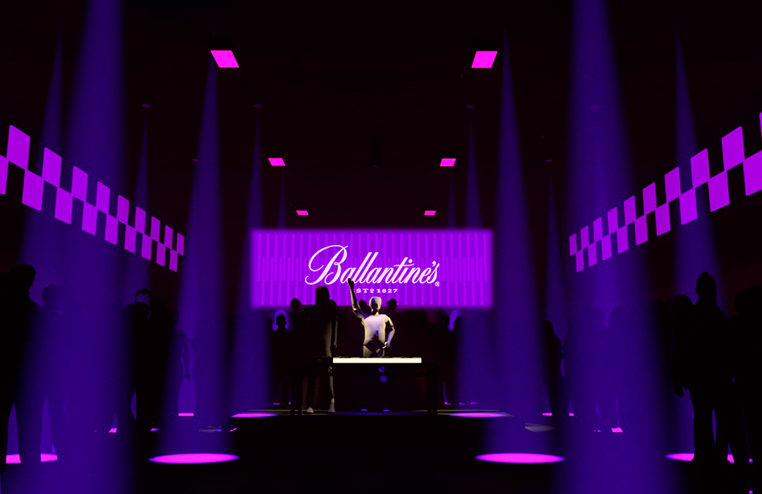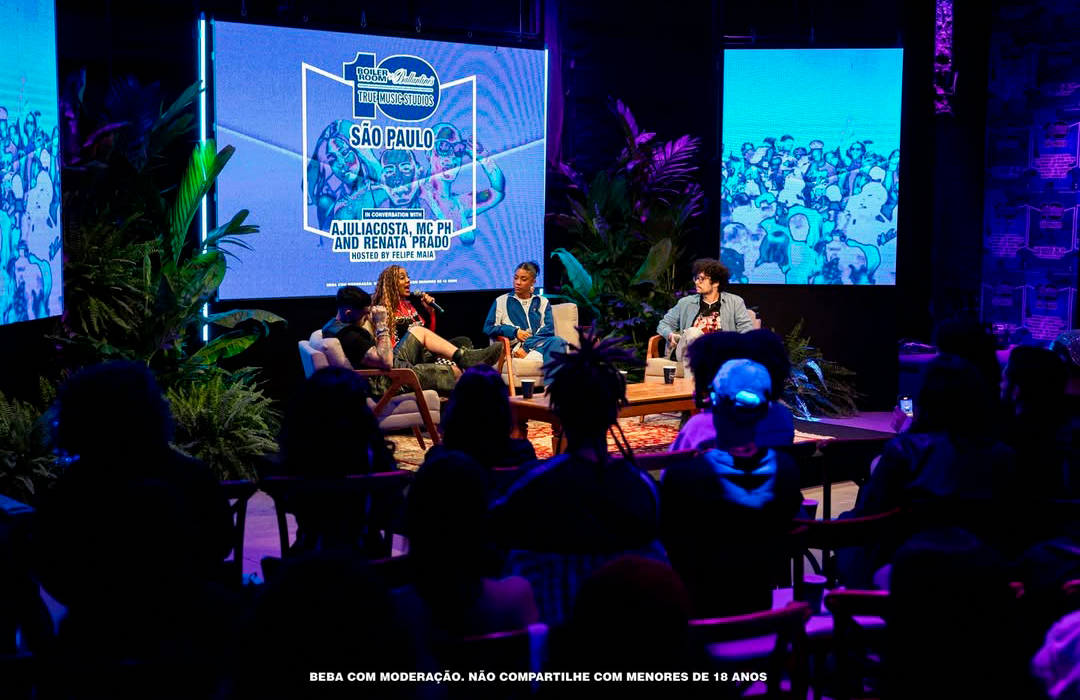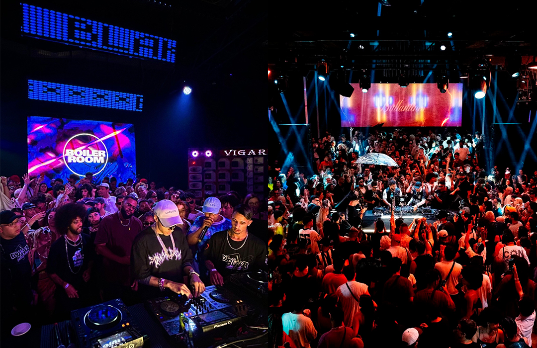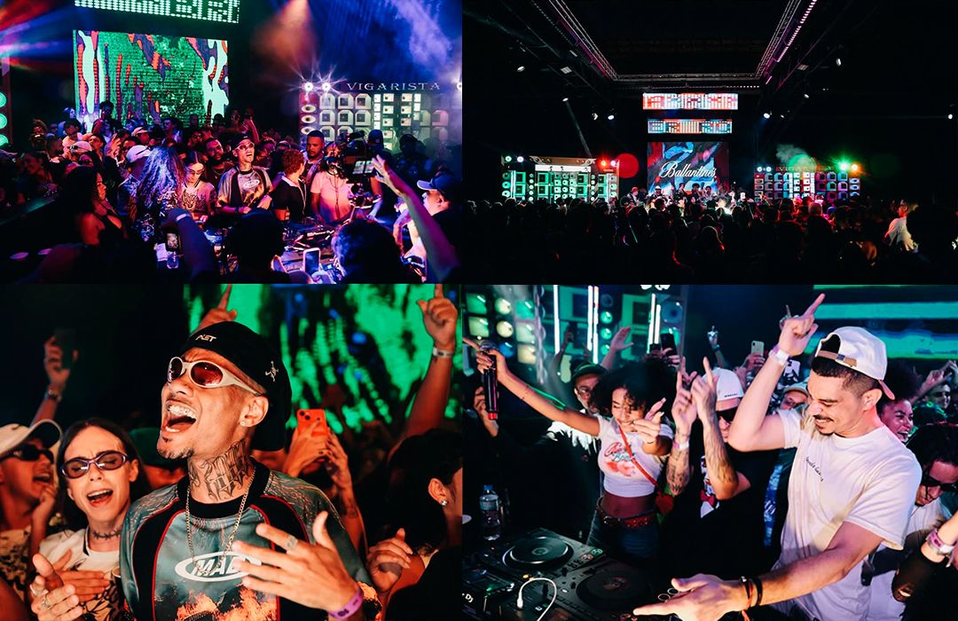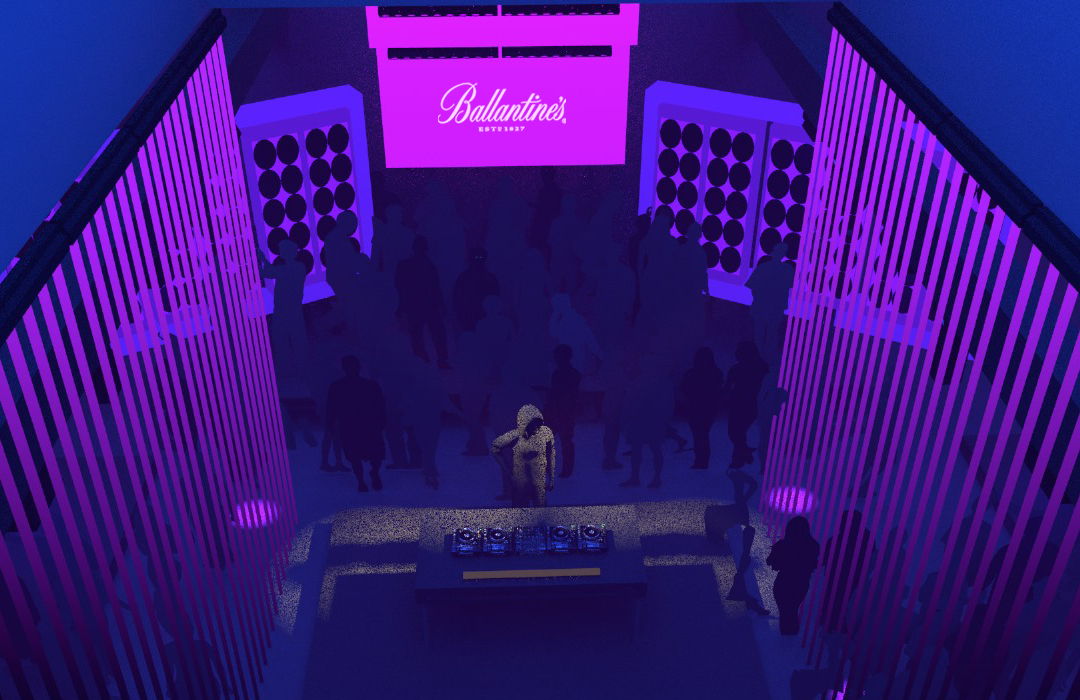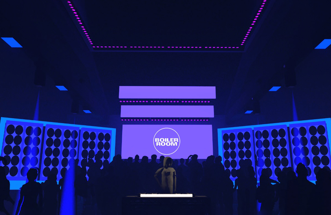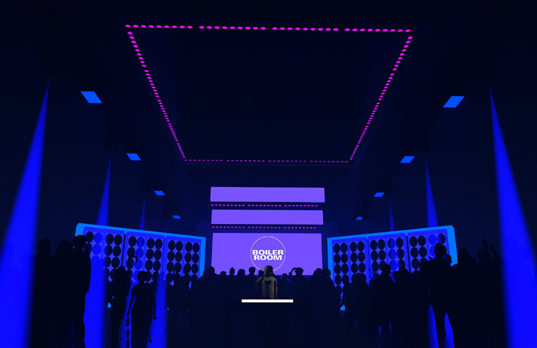 Para o Boiler Room São Paulo, edição especial Ballantines True Music, que privilegiava diversas vertentes da música brasileira, com destaque especial para o funk paulista, projetamos duas pistas: a primeira com dois paredões de som, típicos dos bailes de rua brasileiros, e entre eles painéis de led que projetavam conteúdos ao vivo, além dos nomes des djs e do evento; e a segunda com 80 chapas de acrílico reflexivo + um fundo composto por lâmpadas tubulares atrás de uma placa de 2.10m de policarbonato alveolar, que além de causar um efeito de glow na luz dos leds, também servia como um canvas tanto para lasers como um projetor de vídeo.