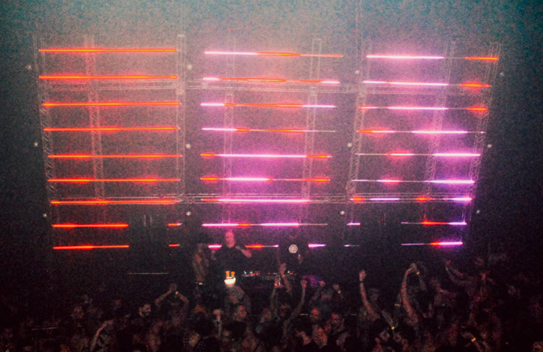 Uma estrutura em forma de grade é suspensa sobre o vão livre do Teatro Mars, edifício icônico do Bixiga que possui um pé direito de 17 metros. Essa característica permitiu a instalação dessa grande peça sobre a pista da Dando, composta por lâmpadas tubulares e uma matriz de luzes quentes. As varas cênicas presentes no teto do espaço foram ocupadas por estrobos e moving heads, que ajudaram na composição de luzes e sombras do evento e serviam também para iluminar performers que eram suspensos por essas varas sobre o público