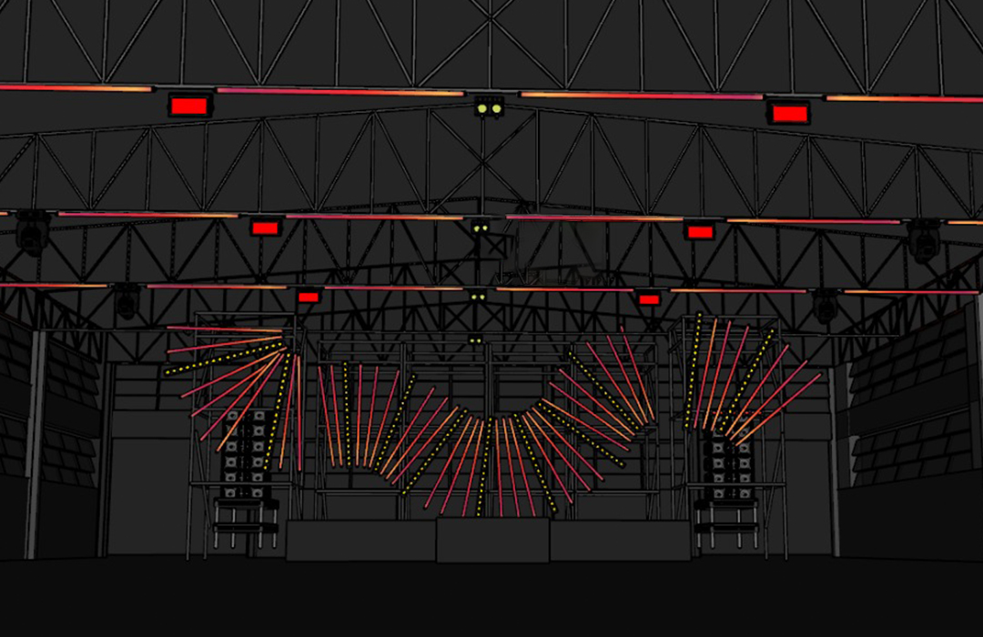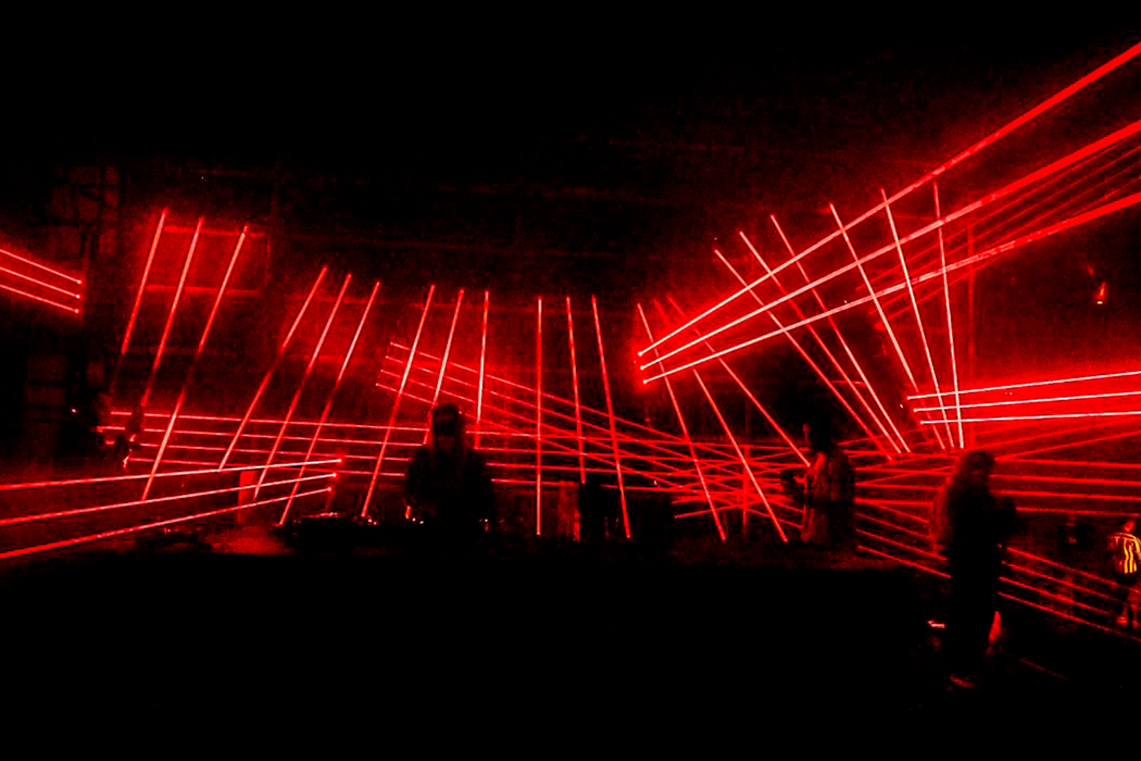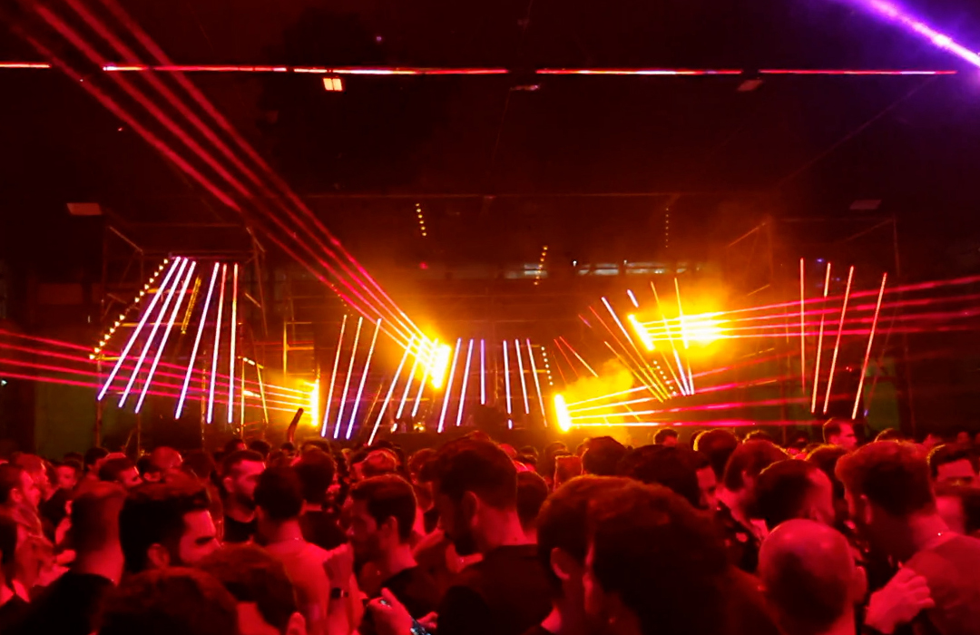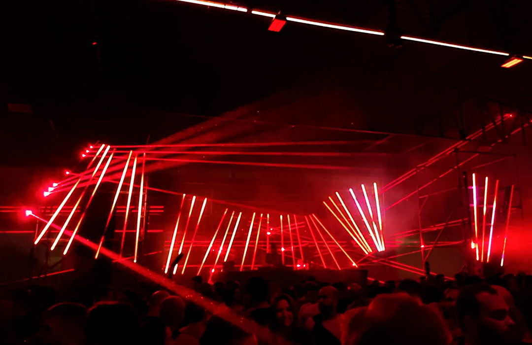 Para o projeto da festa Javali em uma ex-indústria de SP, utilizamos diversas ribaltas laser, que sobrevoavam a pista de dança e, em conjunto com tubulares, strobos, bruts e moving heads formavam o ambiente imersivo da pista de dança do evento