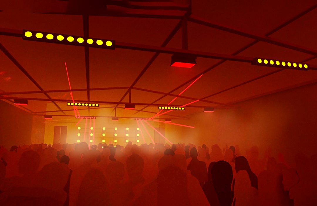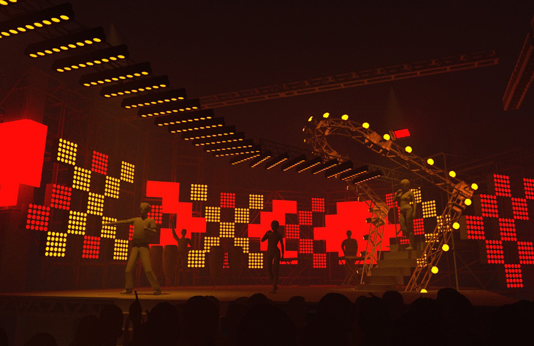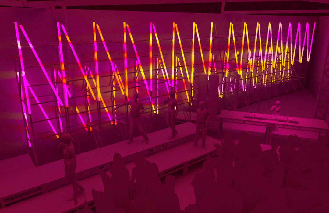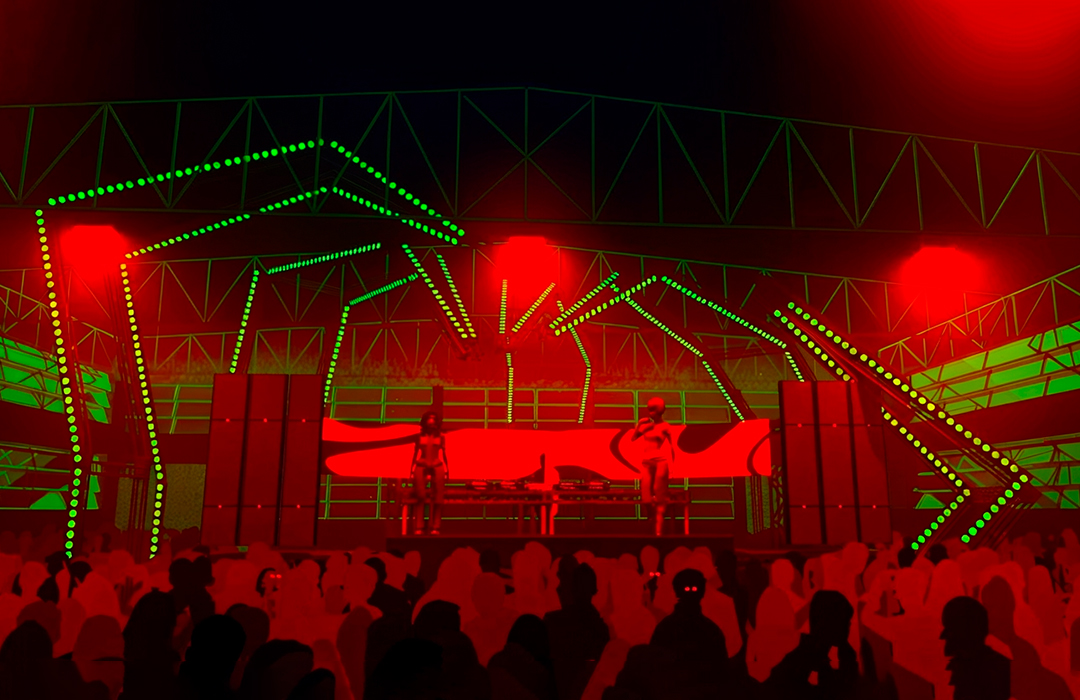 Para o desenho do palco principal, partimos da sobreposição dos signos Cobra e Fogo, relacionando-os ao momento vivido pela festa e projetando um símbolo de renascimento e resistência ao novo ciclo. A partir daí, chegamos à imagem de Boitatá – cobra de fogo da cultura popular brasileira originada na iconografia tupi-guarani. Através da boca da cobra, artistes adentravam o palco, que se estendia em forma de passarela sobra a pista, onde ocorreram tanto uma ‘ball’, quanto um defile. Sobre essa passarela, pairava uma linha de ribaltas que vinham da boca da Boitatá, em referência ao fogo expelido por essa figura. A textura da pele da cobra era composta por painéis de LED + luzes quentes, e sobre os pilares da ex-fábrica, uma sequência de telões transmitiam o evento em 4 câmeras so vivo.