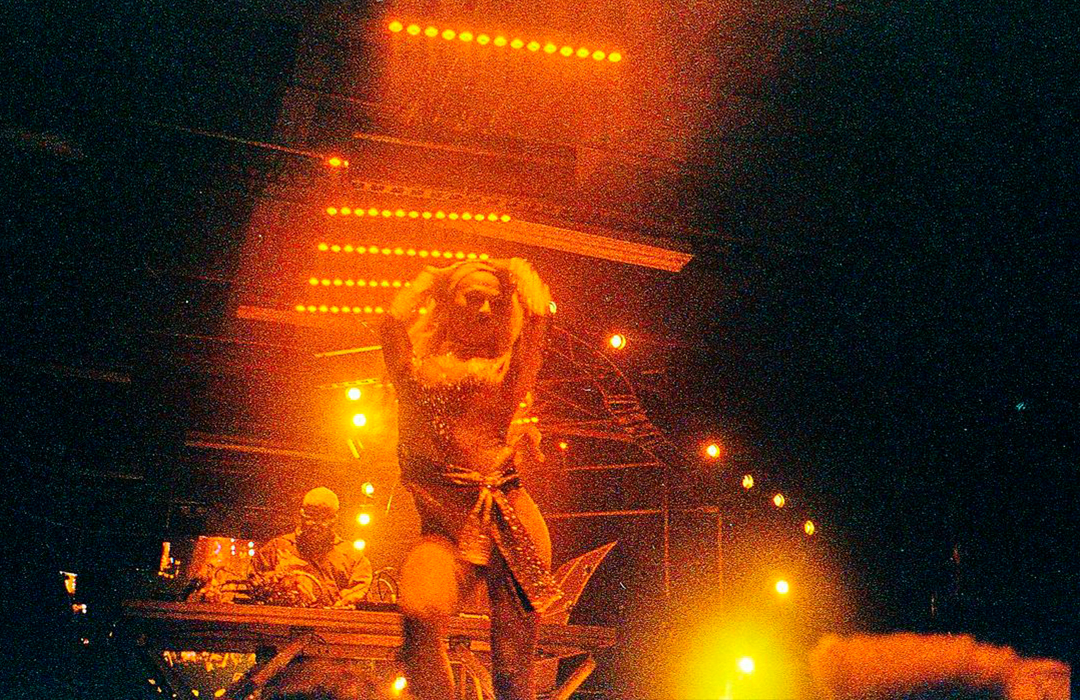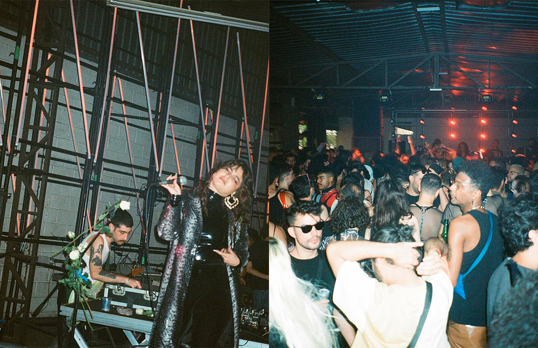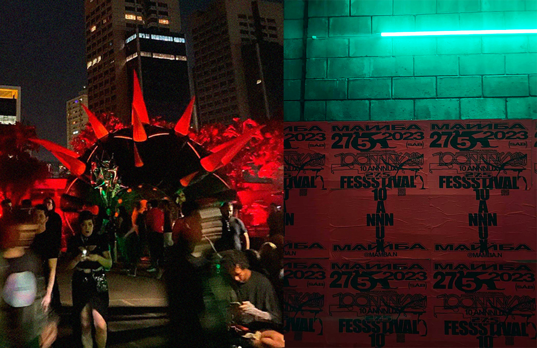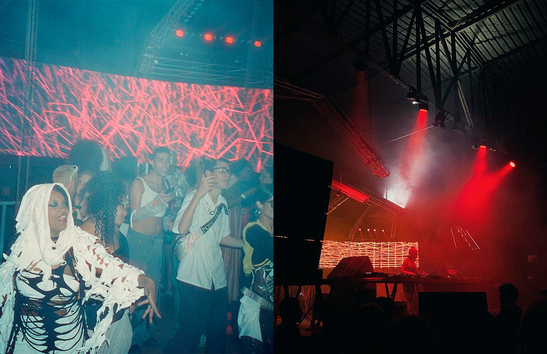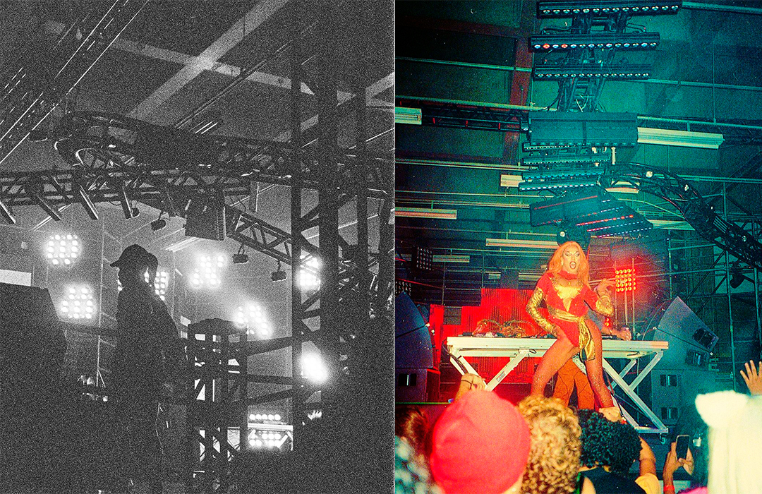 Para o desenho do palco principal, partimos da sobreposição dos signos Cobra e Fogo, relacionando-os ao momento vivido pela festa e projetando um símbolo de renascimento e resistência ao novo ciclo. A partir daí, chegamos à imagem de Boitatá – cobra de fogo da cultura popular brasileira originada na iconografia tupi-guarani. Através da boca da cobra, artistes adentravam o palco, que se estendia em forma de passarela sobra a pista, onde ocorreram tanto uma ‘ball’, quanto um defile. Sobre essa passarela, pairava uma linha de ribaltas que vinham da boca da Boitatá, em referência ao fogo expelido por essa figura. A textura da pele da cobra era composta por painéis de LED + luzes quentes, e sobre os pilares da ex-fábrica, uma sequência de telões transmitiam o evento em 4 câmeras so vivo.