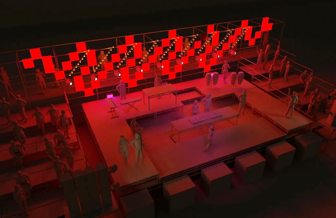 Nesse projeto partimos do desejo de estilhaçar a proposta de uma só tela/narrativa em um painel led-serpente de imagens fragmentadas, algo próximo da experiência multifacetada de uma pista, destacando-se tanto o individual como sua relação com o todo -> corpo e a multidão. A topografia do palco/arquibancada criava escadas e espaços de maior evidência e/ou intimidade, num esforço para minimizar a barreira entre artistes-público, transformando o espaço como um todo em um imenso fluxo-convite.
