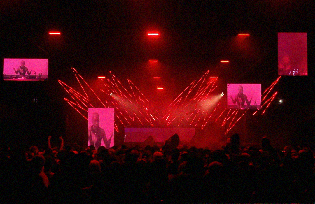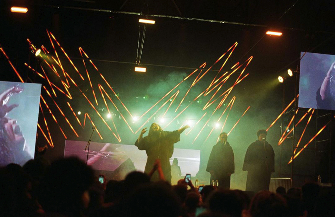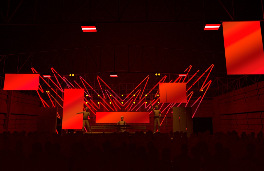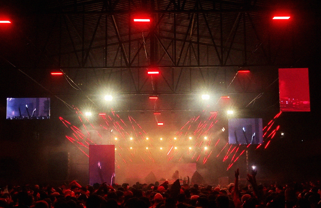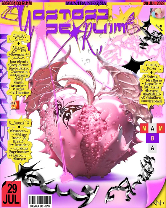 Para a edição Gostosa de Ruim, da Mamba Negra, propusemos uma composição assimétrica de painéis de LED, que sobrevoava o galpão – parte de uma indústria gráfica no passado – reimaginando-o como pista de dança; Adicionamos à composição tubulares inspiradas no tema, que formavam um rosto relacionado com a iconografia do funk ‘bad boy’, reinventado como ‘gostosas de ruim’. As tubulares envolviam os painéis de LED e, com outros equipamentos -como luzes quentes em contraluz e estrobos a pino no teto- formavam um ambiente de imersão em luz e sombra. Complementando o desenho, os painéis de led transmitiam uma colagem entre o que acontecia no palco/pista e intervenções digitais, contribuindo para a construção desse espaço-brecha nas antigas indústrias de SP.