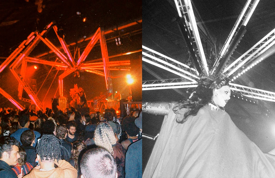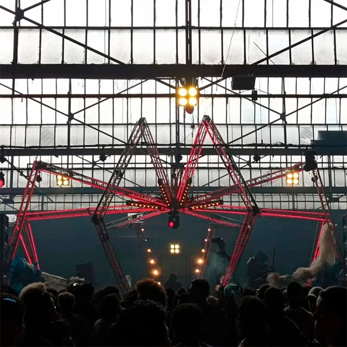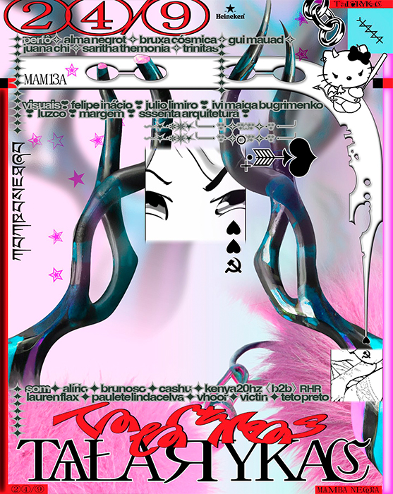 Partindo do tema “talarykas”, da @mamba.n , dividimos as pistas entre “amante” e “fiel”. Para a pista ‘amante’ a intenção era a de construir um símbolo ambíguo: ao mesmo tempo ameaçador e delicado/frágil. Adentrar o imaginário das talarykas e reinventá-las como monstras fura-olhos a derrubar a monogamia. Uma elegant alien, predadora e protetora à Louise Bourgeois. A esse signo-aranha sobrepusemos a ideia da busserpente, símbolo da Mamba, tbm uma imagem dúbia, convidativa & peligrosa. Olhos de ribaltas-laser pra furar, um corpo/clitóris-farol, uma busserpente dentada de luz quente incendiária e 8 pernas de linhas pulsantes luminosas #batemais #armadura #projeções