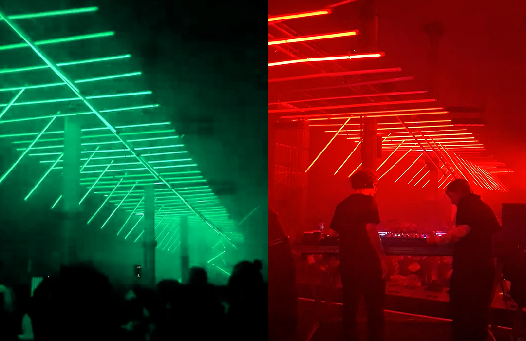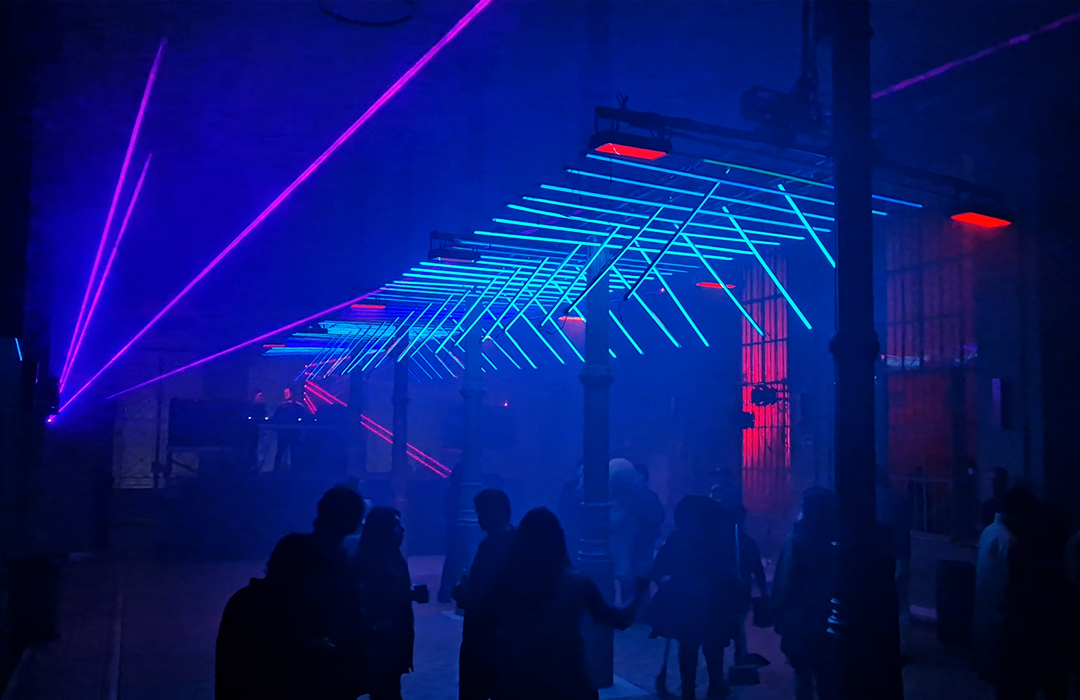 Para a festa secreta da galeria Yehudi Hollander-Pappi, na abertura da 36ª Bienal de Arte de São Paulo, desenhamos uma trama de luz entre as colunas de ferro do hoje Palacete da Sé, espaço icônico do centro, carregado de memórias silenciosas. As luzes suspendiam o instante e reativavam camadas invisíveis em realismo espectral, ressoando os ecos do passado e atravessando o presente, transformando o espaço em um arquivo vivo da cidade, onde vestígios, espectros e murmúrios também se fazem presentes.